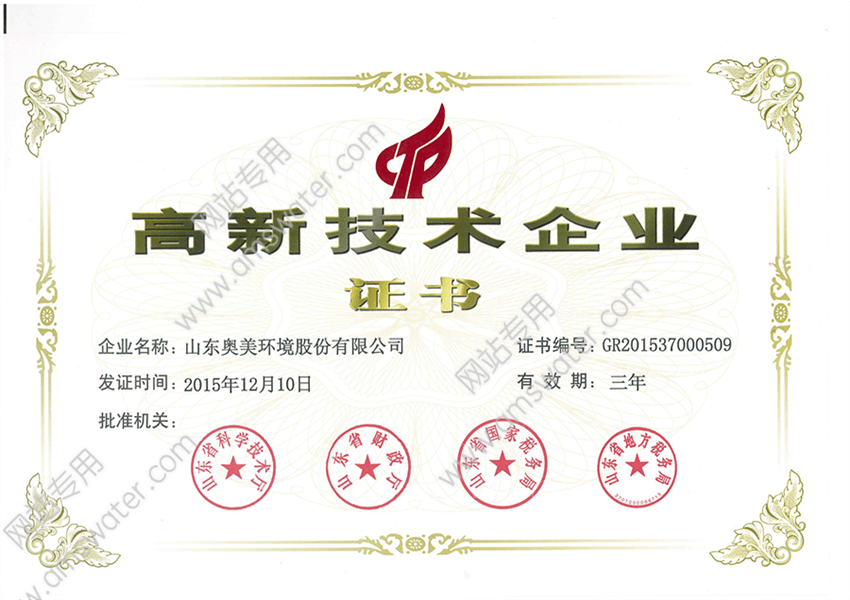 山東奧美環(huán)境股份有限公司(以下簡稱“公司”)于2016年3月30日收到了由山東省科學技術(shù)廳、山東省財政廳、山東省國家稅務 局、山東省地方稅務局聯(lián)合頒發(fā)的《高新技術(shù)企業(yè)證書》。公司取得 的高新技術(shù)企業(yè)證書編號:GR201537000509,發(fā)證時間:2015 年 12 月 10 日,有效期:三年。