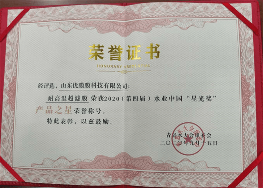 優(yōu)膜科技耐高溫超濾膜榮獲2020(第四屆)水業(yè)中國(guó)“星光獎(jiǎng)” “產(chǎn)品之星”榮譽(yù)稱(chēng)號(hào)