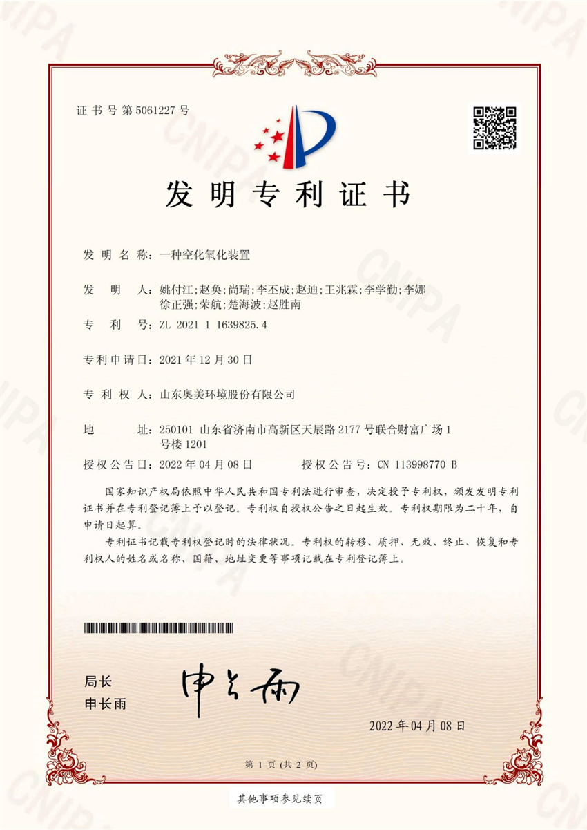 日前,公司又獲得一項發(fā)明專利證書,名稱為“一種空化氧化裝置”,專利號為ZL2021116398254。